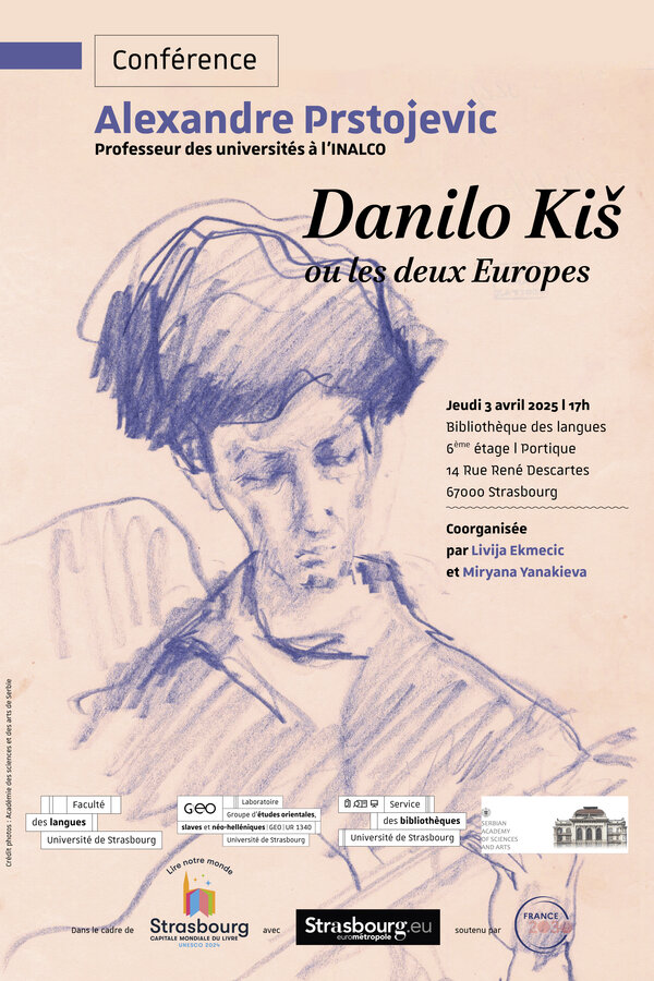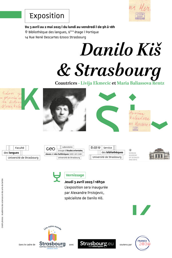 Exposition du 3 avril au 2 mai 2025 | du lundi au vendredi | de 9h à 18h Bibliothèque des langues, 6ème étage | Portique 14 Rue René Descartes 67000 Coautrices - Livija Ekmecic et Maria Baliassova L'exposition sera inaugurée par Alexandre Prstojevic, spécialiste de Danilo Kiš.